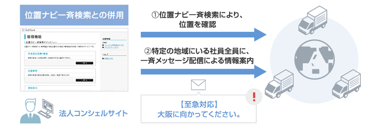 法人コンシェルサイト上で「一斉メッセージ配信」、「位置ナビ一斉検索」のインターフェースは独立しています。
