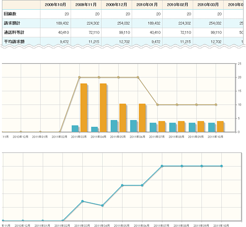 過去24ヵ月間の請求額の推移を全回線・部署別・回線別に表示します。