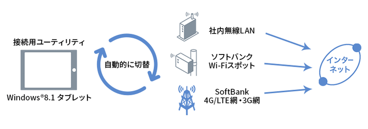 ソフトバンクWi-Fiスポットへの接続は専用の接続用ユーティリティからのみご利用いただけます。接続用ユーティリティは「Wi-Fiアクセス for ビジネス(タブレット)」向けのものをご利用ください。「Wi-Fiアクセス for ビジネス」向けの接続用ユーティリティは対応機種(Windows®8.1 タブレット端末)ではご利用頂けませんのでご注意ください。4G/LTE・3GおよびソフトバンクWi-Fiスポット以外への接続はお客さまでの事前設定が必要となります。また、お客さま設定の無線LANへ接続される場合、接続時の認証が手動で必要となる場合があります。ソフトバンクWi-FiスポットのSSID等接続設定は初期設定で登録されておりお客さまにて変更することはできません。ソフトバンクWi-Fiスポットの接続用パスワード(お申し込み時に登録された4桁の交換機暗証番号)を初期設定時に入力する必要があります。接続用ユーティリティ並びにソフトバンクWi-Fiスポットをご利用いただくには、本サービスに加入したUSIMカードが挿入された対応機種(Windows®8.1 タブレット端末)が必要となります。ソフトバンクWi-Fiスポット以外の無線LAN回線の品質およびご利用については、当社は一切の責任を負いません。SoftBank 4G/LTEのご利用には4G料金プランに加入した対応機種(Windows®8.1 タブレット端末)が必要です。(2015年8月19日現在 対応機種(Windows® 8.1タブレット)はThinkPad 10 for SoftBank、Surface 3のみ)
