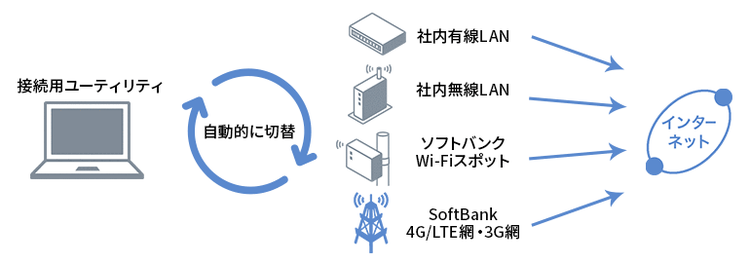 Wi-Fi・4G/LTE・3G・有線のネットワークを自動で切替え、面倒な認証作業をすることなく自動で接続できる接続用ユーティリティをご提供します。