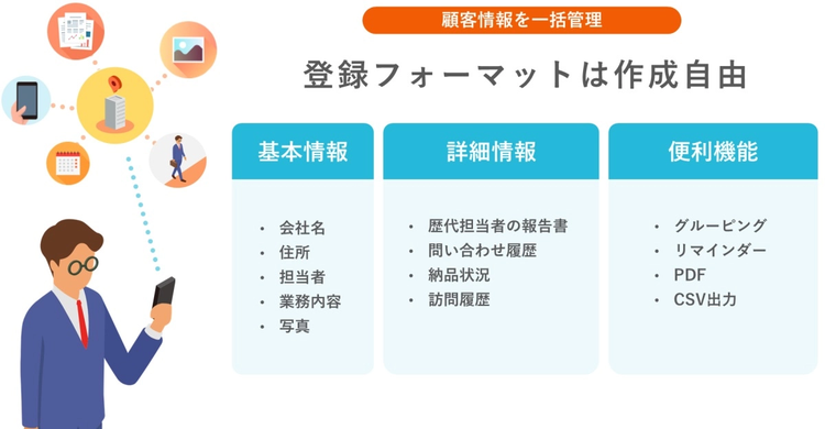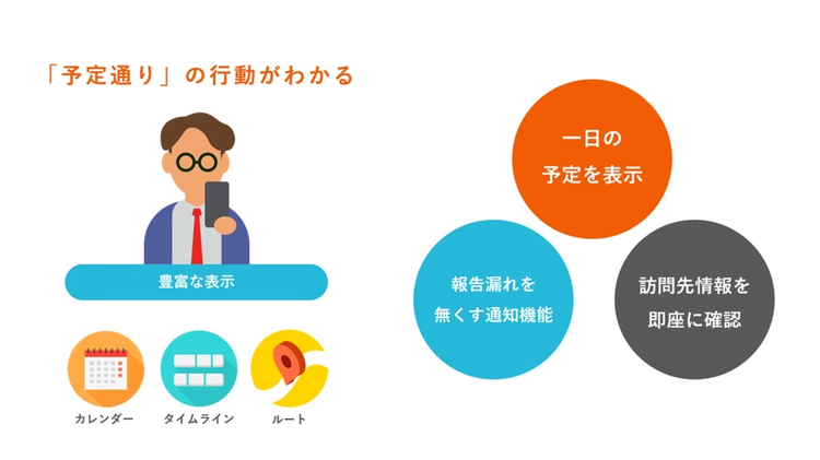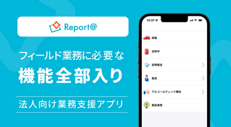 報告書の作成や顧客情報の管理をはじめとし、スマホ一つで訪問業務を支えるサービスです。