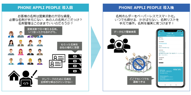 PHONE APPLI PEOPLEに登録いただくことで会社の資産としてデータ化できるだけでなく、スマホで簡単に操作・検索が可能です。