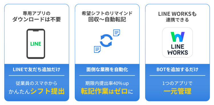 - 従業員が使い慣れているLINE / LINEWORKSからシフト提出が可能で、運用サポートも充実しているため、圧倒的な現場定着を実現