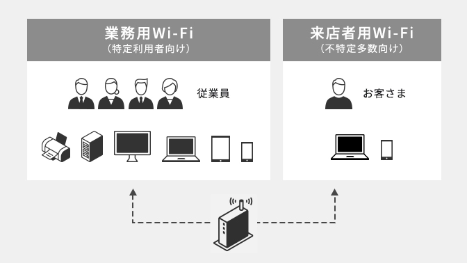 SSIDを変えて登録することにより、従業員用と来店者用など1台でWi-Fiを分けることができます。