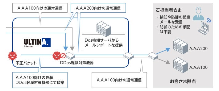 また、不正なパケットをルータまたはDDoS軽減対策機器にてブロックし、不正なトラフィックや帯域の圧迫を防止します。攻撃の検知時や回復時にはアラームメールが送信されます。また、トラフィックレポートをWeb上で閲覧することが可能です。