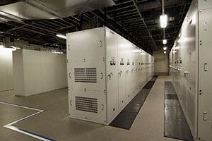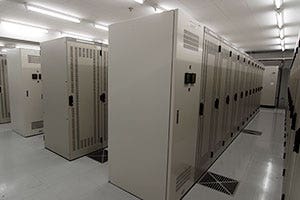 ビル給電は、信頼性の高い「3スポットネットワーク給電」。 各フロア1000KVAの容量をもつUPSを通じて各ラックに供給。