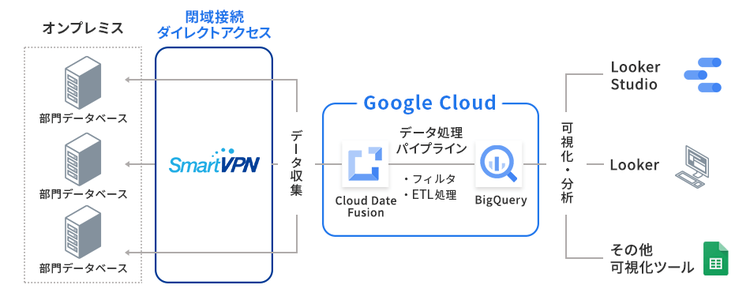 - ソフトバンクの閉域網接続サービスでセキュアにデータ転送を行い、BigQuery にデータが集約(データウェアハウス)