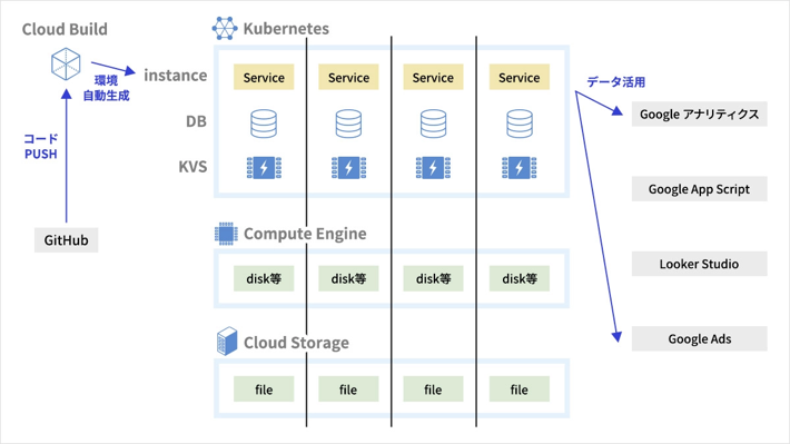 - kubernetes(GKE) 導入により、namespace を区切り、必要なサービスをpod稼働させることで数十人もの専用の開発環境を低コストで実現