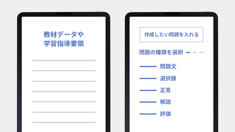 4択、並び替え、一門一答などバリエーション豊富な練習問題をクラスのレベルに応じた難易度で作成。先生の働く環境DXをアシストします。