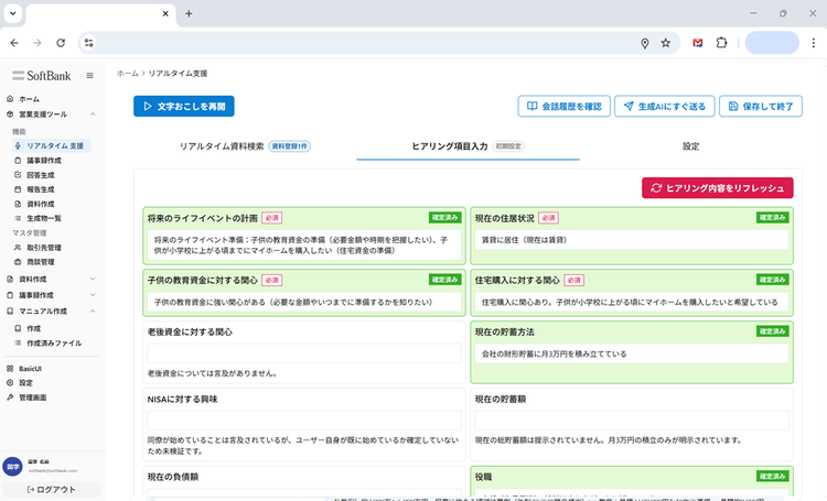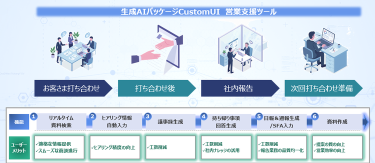 打合せ時のヒアリング情報自動入力や打ち合わせ後の議事録・社内報告資料作成、次回打ち合わせに向けた資料作成などの機能で、生成AIが営業業務を一貫してサポート。効率と提案の質を飛躍的に向上させます。
