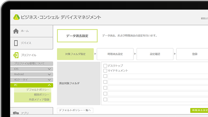 遠隔からデスクトップやマイドキュメントなど特定フォルダやファイルを消去。デバイスがネットワークに接続されていない、または電源が入っていなくても、一定期間後に強制消去される機能も備えています。