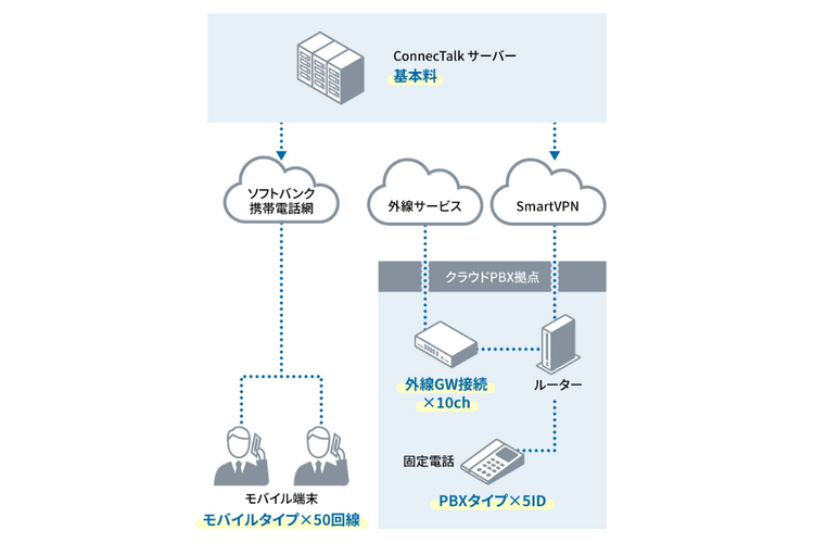 オンプレミスのPBXを利用することなく、固定電話回線をConnecTalkと接続し、0ABJ/050の番号を利用して、モバイル端末またはIP電話機で通話をされるお客さま向け