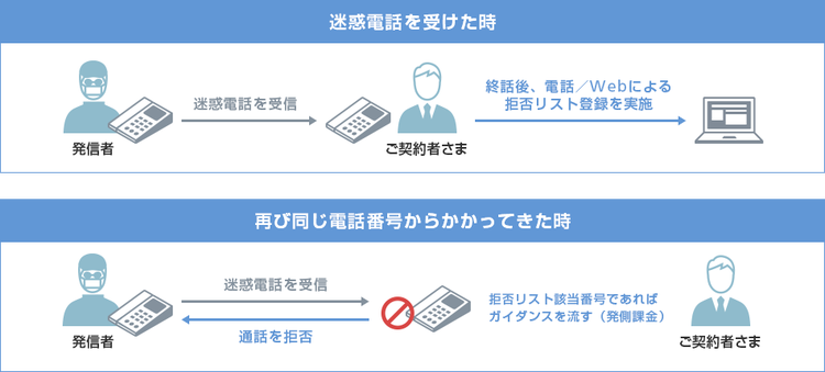 - 着信お断りリストを追加でお申込みされた場合、ご利用には追加した着信お断りリストへ電話番号の設定が必要です。