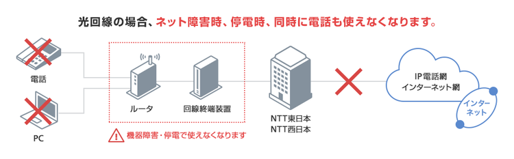 • 停電時に電源供給を必要としない電話機、もしくはTA(ターミナルアダプター)の場合になります。