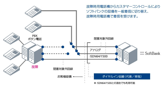 ダイヤルイン故障時切替サービスは、故障、停電などによりお客さま機器(PBX、ボタン電話など)が機能しなくなったときに、カスタマーコントロール※によりダイヤルイン機能を停止させ、一般回線として着信させるサービスです。提供対象はアナログ回線です。