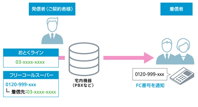 フリーコール番号通知サービスは、おとくラインからの発信時、おとくラインの電話番号の代わりにご契約されているフリーコールスーパーの番号(0120/0800)を通知することができます。