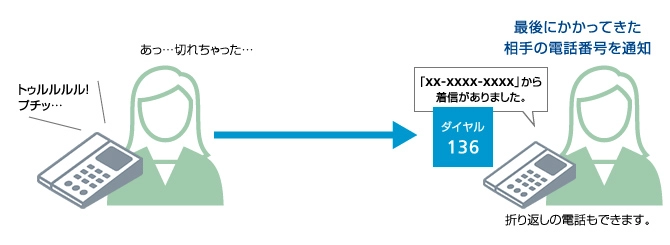 着信番号案内サービスは、最後にかかってきた相手の電話番号を知りたいときに「136」をダイヤル、ガイダンスに従って操作することで相手先の電話番号を音声でお知らせするサービスです。