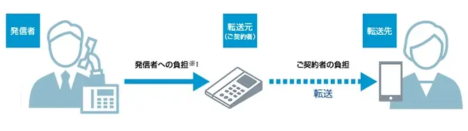 - 着信転送時通話料金は「発信者-転送元」間では“発信者”に、「転送元-転送先」間では“転送元”である多機能転送サービスご契約者にそれぞれ課金されます。