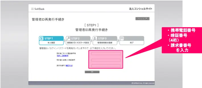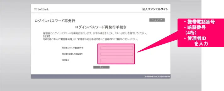 管理者ID再発行手続きページで、ご本人確認のためご契約の携帯電話番号、暗証番号(4桁)、請求先番号をご入力ください。