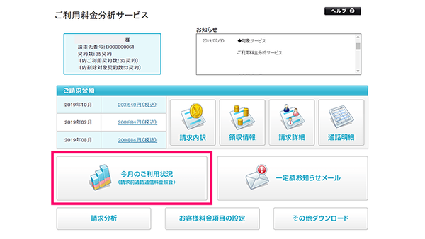 メインメニューの「ご利用料金分析サービス」をクリックします。