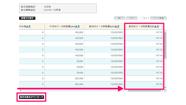画面表示のスクロールを一番右に移動させると、「前月のデータ利用量(GB)」が表示されます。