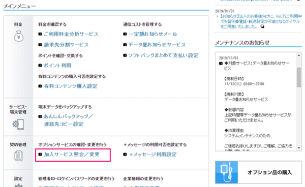 手順2 「加入サービス照会/変更」をクリック