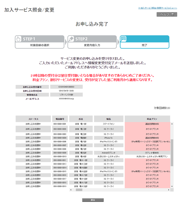 変更のお申し込みは完了です。受付完了メールをご確認ください。