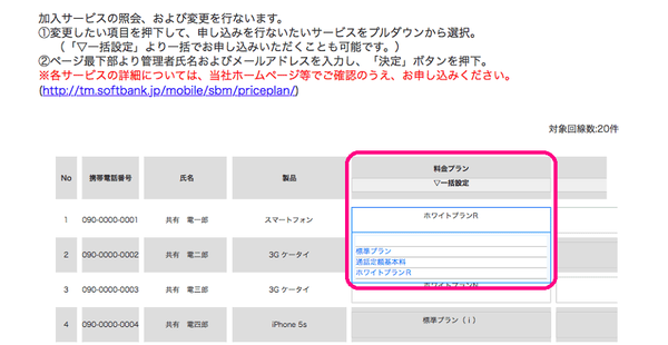 「ホワイト法人24」やデータカード用プランをご契約中の回線は変更できません。レンタルサービスをご契約中の回線はご利用になれません。その他、お客さまのご契約内容によりお申し込みいただけない場合がございます。本サイトから受付できないお客さまは、ソフトバンク・ビジネスコールセンターまでお問い合わせいただきますようお願いいたします。
