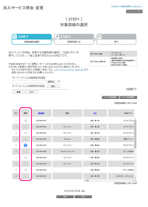 「対象回線の選択」画面にて、回線ごとに料金プランをご確認いただけます。料金プランやオプションを変更する場合は、変更したい電話番号にチェックし、 「決定」ボタンをクリックします。