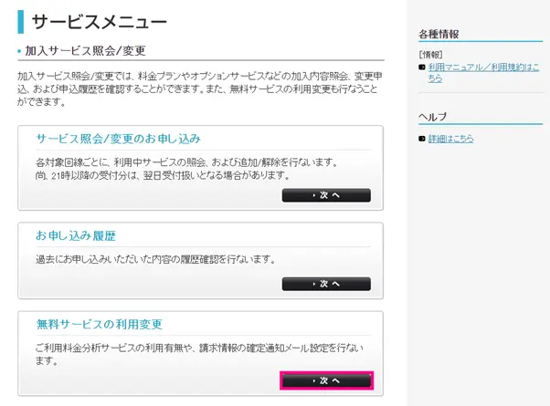 「無料サービスの利用変更」の「次へ」をクリックします。