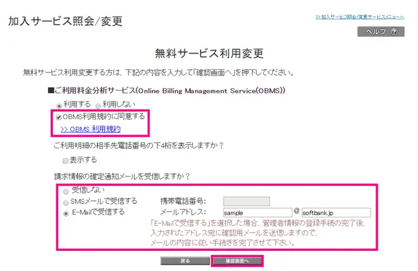 ご利用料金分析サービスOBMS利用規約に同意いただき、請求情報確定通知を受け取る方法を選択します。SMSメールまたはEメールで受信できます。