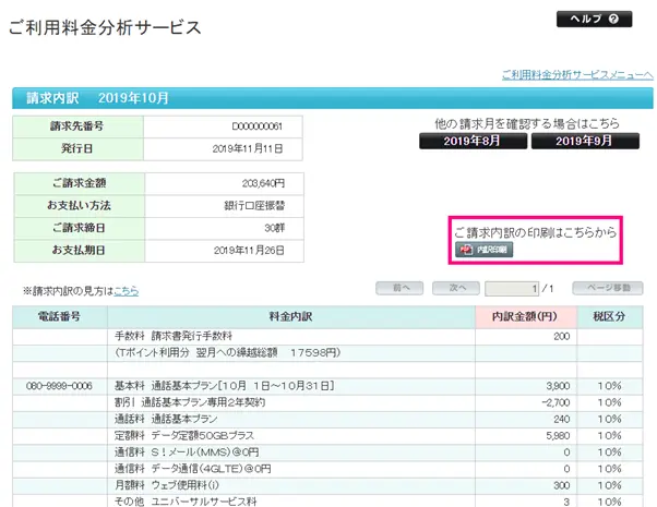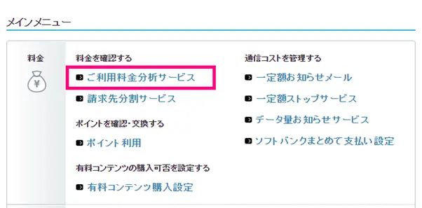 料金メニューの「ご利用料金分析サービス」をクリックします。