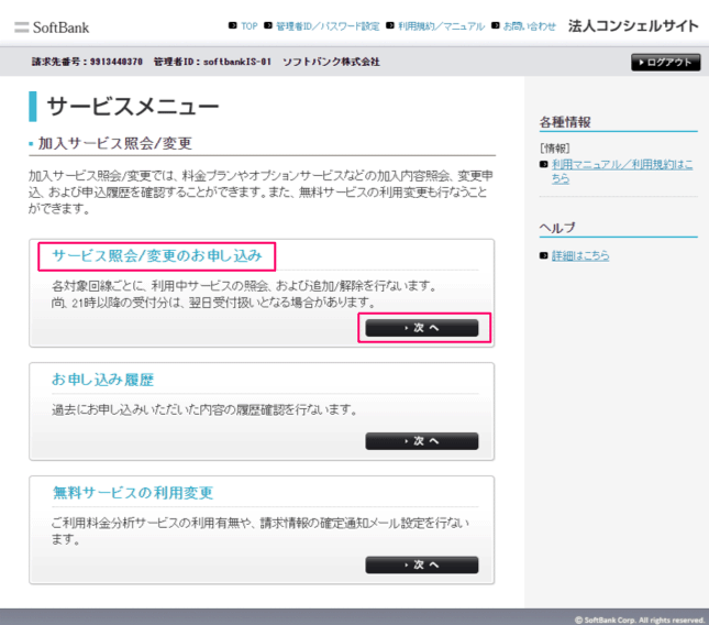 「サービス照会/変更のお申し込み」の[次へ]ボタンをクリックします。