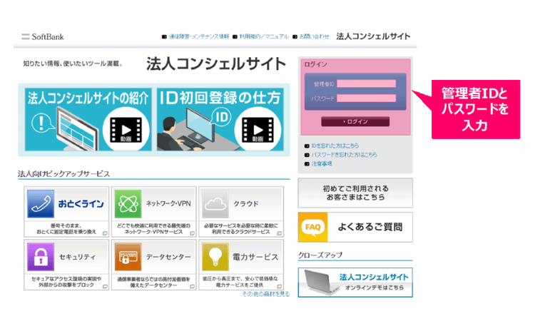 事前にご登録いただいた管理者ID、パスワードで「法人コンシェルサイト」のログイン画面よりログインしてください。