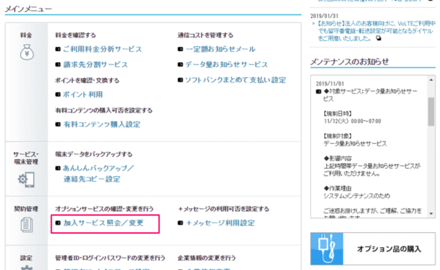 手順2 「加入サービス照会/変更」をクリック