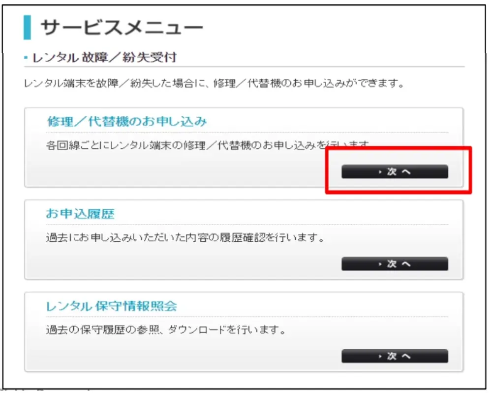 ②修理/代替機のお申し込みの「次へ」ボタンを押下します