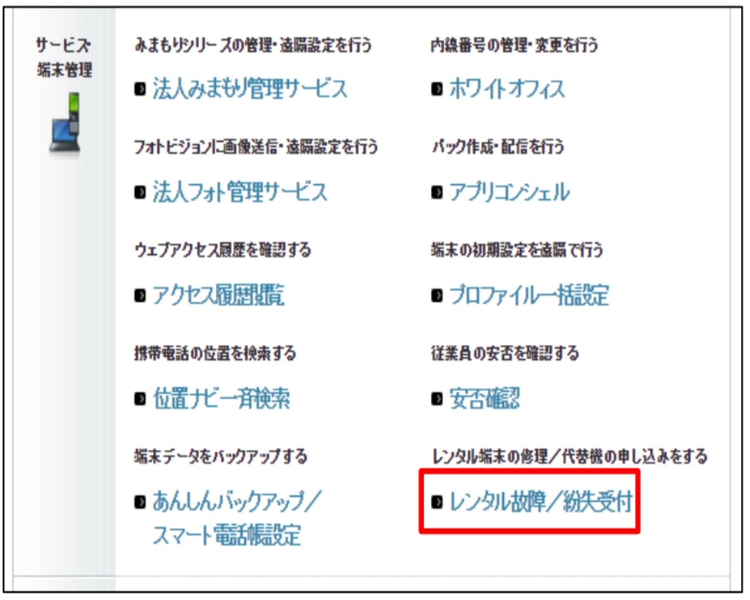 ①法人コンシェルサイトへログインし、サービス・端末管理メニューより「レンタル故障/紛失受付」を押下します。