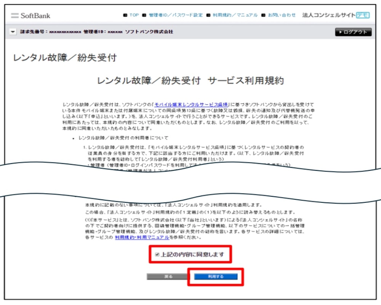 ③利用規約をお読みの上、「上記の内容に同意します」にチェックを入れ、「利用する」ボタンを押下します。