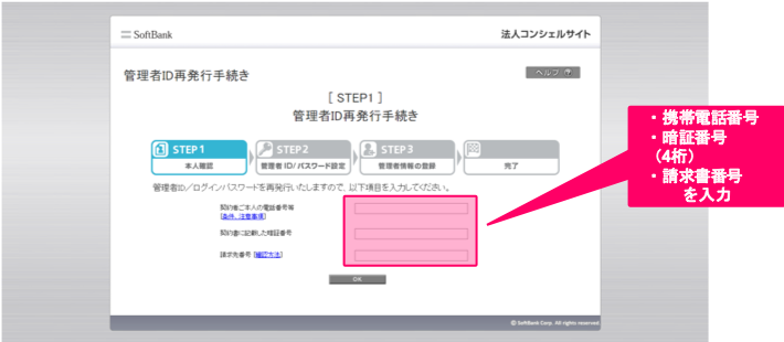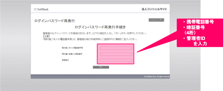 管理者ID再発行手続きページで、ご本人確認のためご契約の携帯電話番号、暗証番号(4桁)、請求先番号をご入力ください。