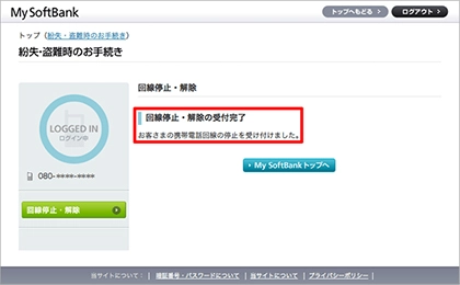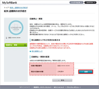TOP画面の「安心・便利サービス」→「端末・回線の停止(解除)」→ 「回線の停止・解除」 →「設定する」でも可能です。