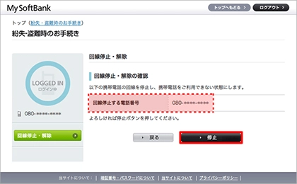 7. 「回線停止する電話番号」を確認して、「停止」を選択します。