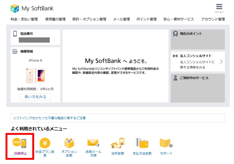 5. My SoftBankにログインできたら、TOPの「よく利用されているメニュー」→「回線停止」を選択します。