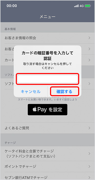 以下画面が表示されたら、カード番号の下4桁を入力し、「確認する」を選択します。