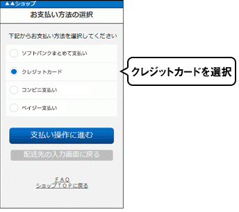 お支払い方法選択画面が表示されましたら、「クレジットカード」を選択して、先に進んでください。