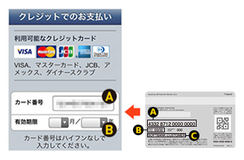 お支払い画面で(A)カード番号と(B)有効期限を入力し、必ず「1回払い」を選択してください。