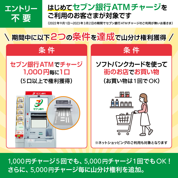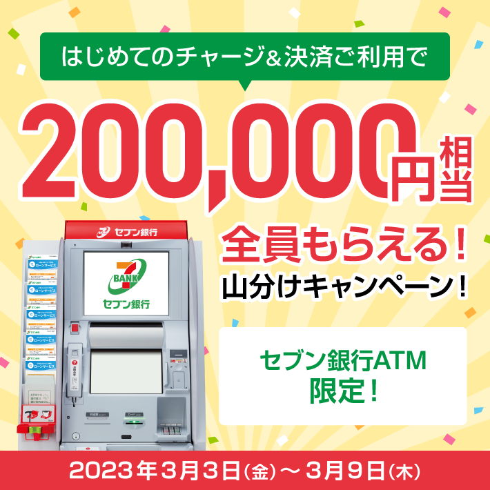 - セブン銀行ATMでのチャージ額5,000円ごとに応募件数が追加となります。