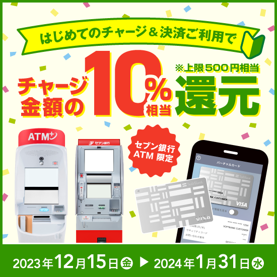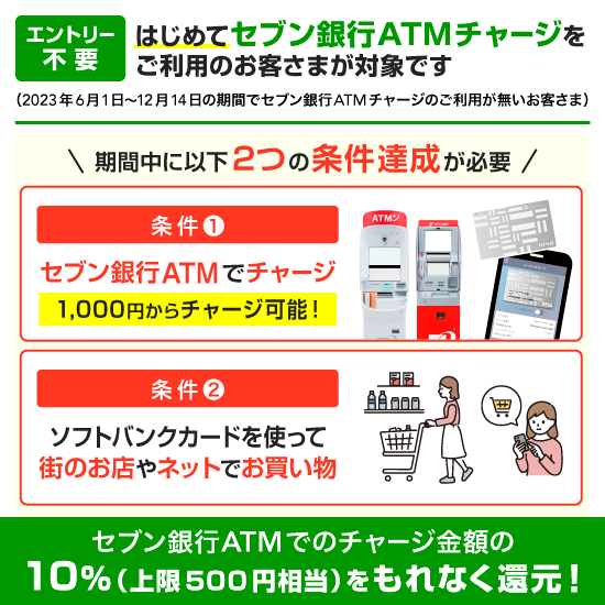 期間中に条件を満たしたお客さまに、セブン銀行ATMでのチャージ金額の10%相当を後日お持ちのソフトバンクカードへ還元いたします!