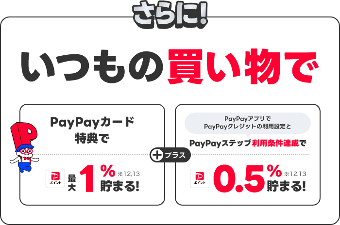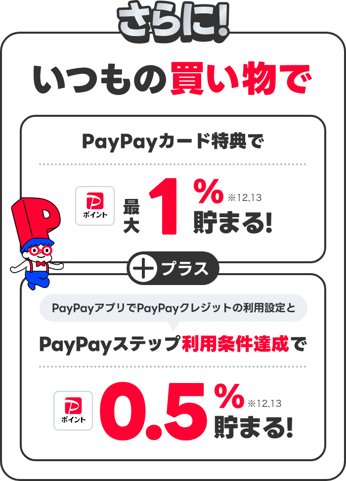 「PayPayクレジット」の利用設定が未完了の場合はPayPayステップの対象外。最大の付与率にはPayPayステップの条件達成(200円以上の決済30回以上かつ決済金額合計10万円以上)が必要。付与率は前月のご利用状況により異なります。また一部対象外の決済あり。付与内訳等の詳細はこちら