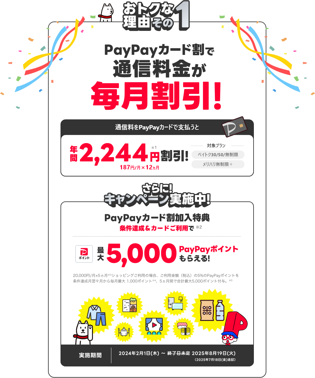ソフトバンクの指定プランに加入(ペイトク無制限/50/30、メリハリ無制限+)し、初めてPayPayカード割加入特典が適用された方が対象です。