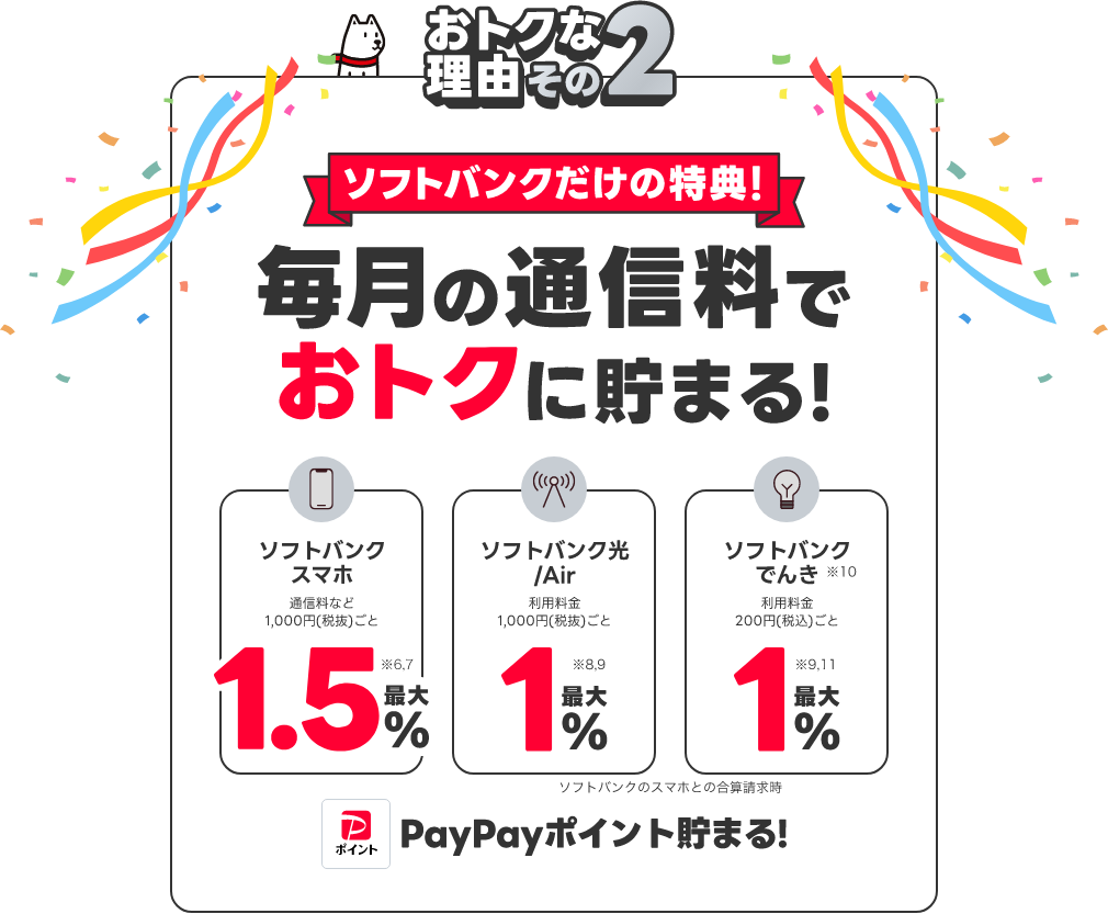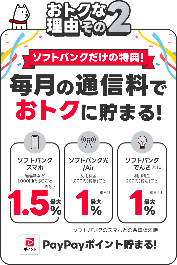 ソフトバンクでんきのみをご利用のお客さまは1%となり、PayPayポイントでの付与となります。PayPayポイントはご利用料金200円(税込)ごとに付与。